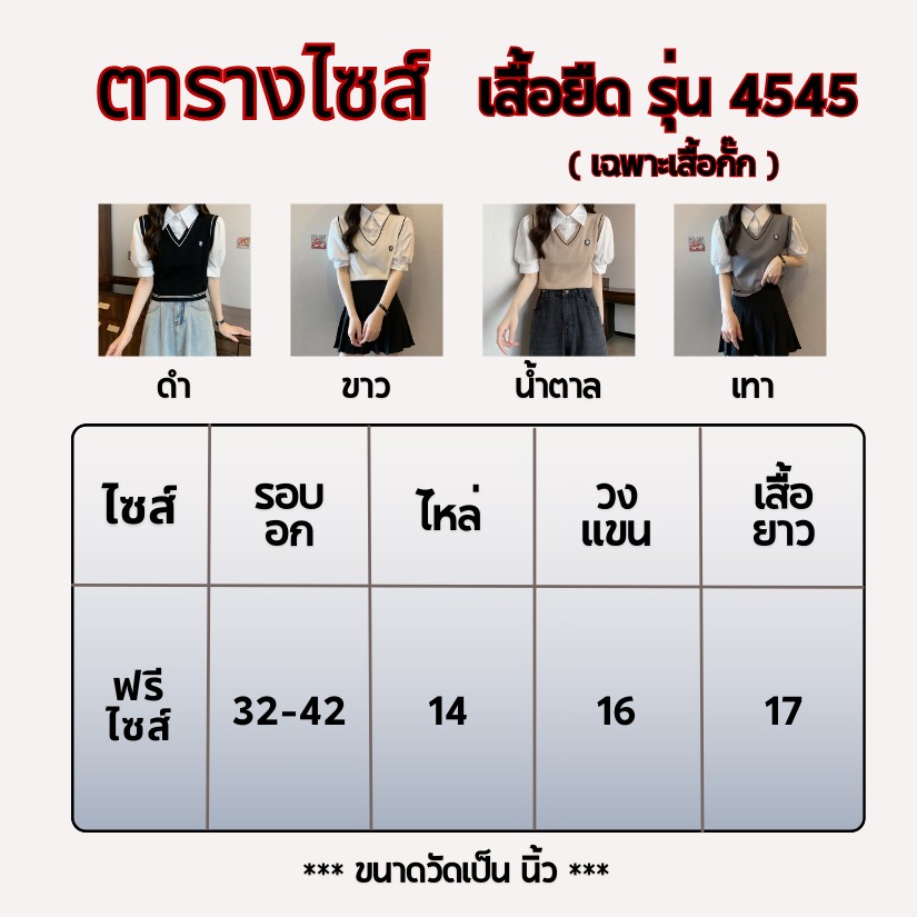Free Size = รอบอก 32-42นิ้ว ไหล่ 14นิ้ว วงแขน 16 นิ้ว ความยาวเสื้อ 17 นิ้ว