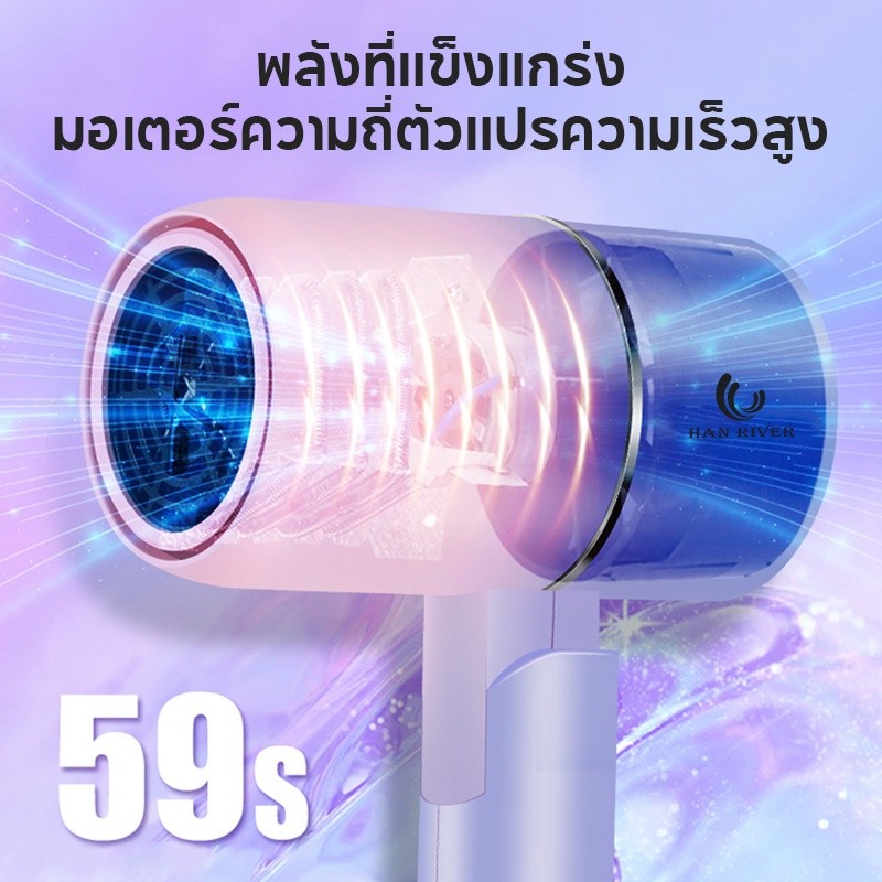 ?แห้งเร็วใน 59 วินาที การออกแบบลมระดับซาลอนทำให้ผมแห้งเร็ว แห้งเร็ว/ดูแลเส้นผม/จัดแต่งทรงผมสามในหนึ่งเดียว ตอบสนองความต้องการการดูแลเส้นผมที่หลากหลาย 59 วินาทีสำหรับผมสั้น 5 นาทีสำหรับผมปานกลางและสั้น และ 8-10 นาทีสำหรับผมยาว