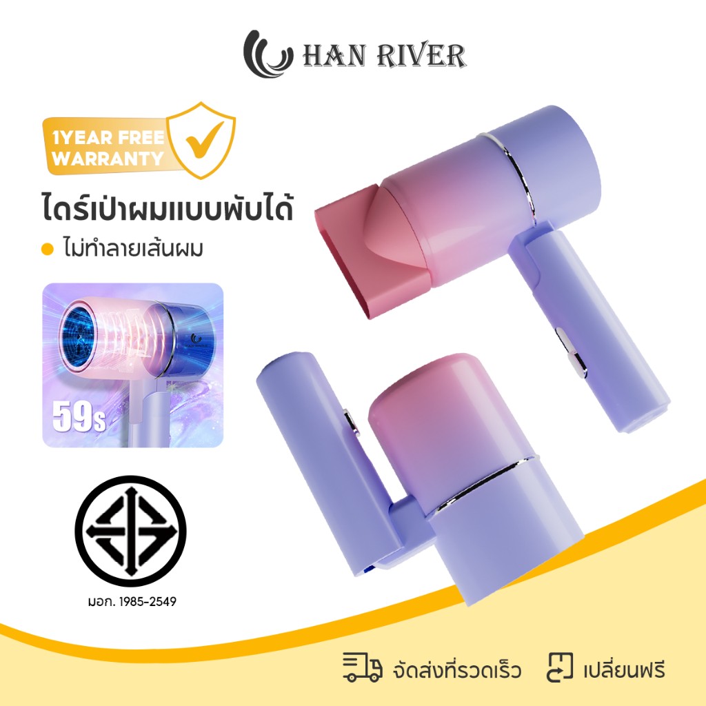 ? ขนาดกะทัดรัด พับเก็บได้ และพกพาสะดวก หยิบได้ง่ายด้วยมือเดียว ทันสมัย และพกพาได้ในเวลาเดียวกัน(ด้ามจับเครื่องเป่าผมแบบพับได้สีม่วง)